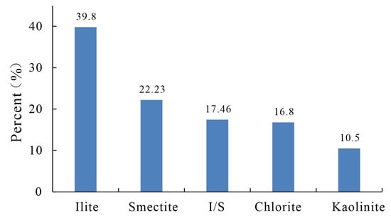 The lithologies of the tight oil reservoirs of the Lucaogou Formation are diverse (Figure 1b), and the composition of minerals is complex (Table 1). The content of clay minerals in the Lucaogou Formation is low (12.5%), and the main components are smectite, illite, kaolinite, chlorite, and I/S. The illite and smectite contents are higher, accounting for 39.8% and 22.23%, respectively. The contents of the I/S mixed-layer and chlorite are slightly lower, accounting for 17.46% and 16.8%, respectively, and the least abundant of the clay minerals is kaolinite, accounting for 10.5% of the clay mineral infill (Figure 4). The Lucaogou Formation has undergone diagenetic activity such as compaction, carbonate cementation, quartz cementation, and clay mineral infilling and dissolution. Quartz, clays (illite and authigenic chlorite), and carbonates are the major pore-filling constituents.
