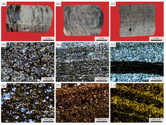 Reservoir rock types of the Permian Lucaogou Formation in the Jimsar Sag. (a) Gray calcareous siltstone, developmental wavy bedding, J36-4, 4346.13 m; (b) gray sandstone, filled calcite strip, developmental wave layering, kneading structure, J10025, 3567.5 m; (c) green argillaceous siltstone, developmental stylolite, J10025, 3618.1 m; (d) lamellar and blocky interaction of mixed fine-grained rock, J36-4, 4373.46 m, PPL; (e) lamellar mixed fine-grained rock, J36-4, 4376.48 m, PPL; (f) lamellar dolomitic siltstone, J36-4, 4340 m, PPL; (g) block-like, fine, calcareous sandstone, J36-4, 4369.5 m, PPL; (h) block limestone, J36-4, 4345.36 m, PPL; (i) lamellar argillaceous dolomite, J36-4, 4353.33 m. PPL: plane-polarized light.
