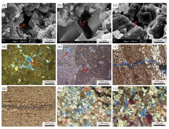 Primary pores mainly refer to residual intergranular pores remaining after a series of diagenetic processes (compaction, cementation, dissolution) experienced by the reservoir during formation []. The thin sections and SEM images mainly showed primary pores that were not filled with heterogeneous materials or cement, organic matter, and the remaining intergranular pores after being filled with clays and authigenic minerals. Pore boundaries were clear and often unevenly distributed (Figure 7h,i).