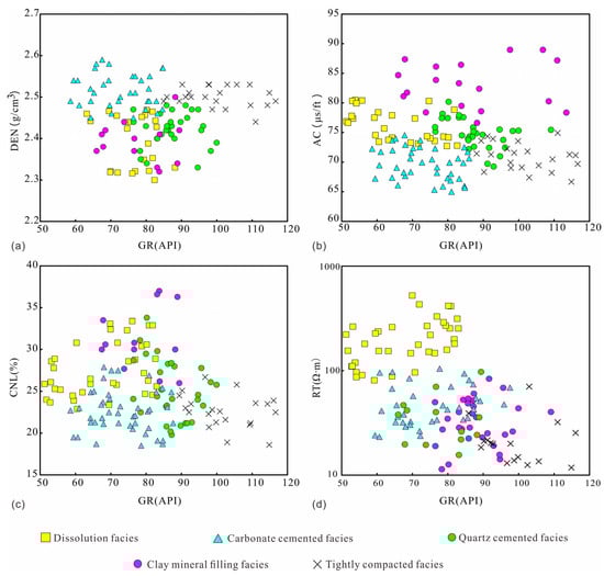 Different diagenetic facies and their well log values. Plots of gamma ray log (GR) versus (a) density log (DEN), (b) acoustic log (AC), (c) compensated neutron log (CNL) and (d) resistivity log (RT) values.