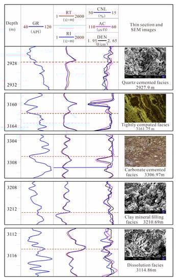 The identification results of the rock slices of 36 samples in the study area showed that carbonate cementation is widely developed in the study area, mainly through calcite, iron calcite, and iron dolomite, with a mass fraction from 1% to 32% and with an average of 7.22%. Carbonate cements, such as calcite and dolomite, developed in dissolved reservoir pores while blocking pore space and reducing reservoir quality [,]. Therefore, the carbonate cement facies is destructive, and the cement produced by multistage carbonate cementation fills the tectonic cracks, increasing the damage to the physical properties of the reservoir (Figure 9c,d). The presence of carbonate cement resulted in the diagenetic facies having medium-high RT values (average 36.3 Ω·m), high DEN values (average 2.4 g/cm3), and lower AC values (average 78.6 μs/ft), in addition to lower CNL values (average 22.9%) (Table 2, Figure 8 and Figure 10).