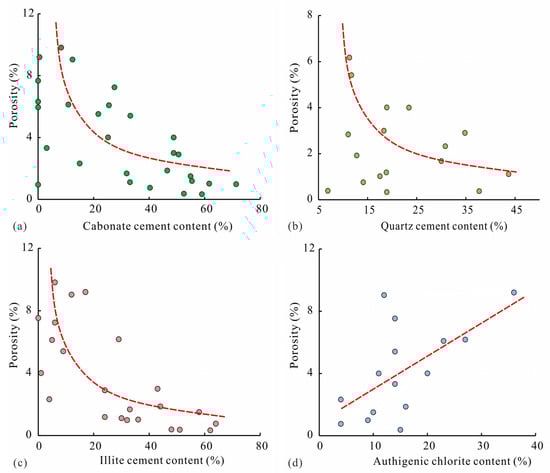 (a) Porosity and carbonate cement content. (b) Porosity and quartz cement content. (c) Porosity and illite content. (d) Porosity and authigenic chlorite content.