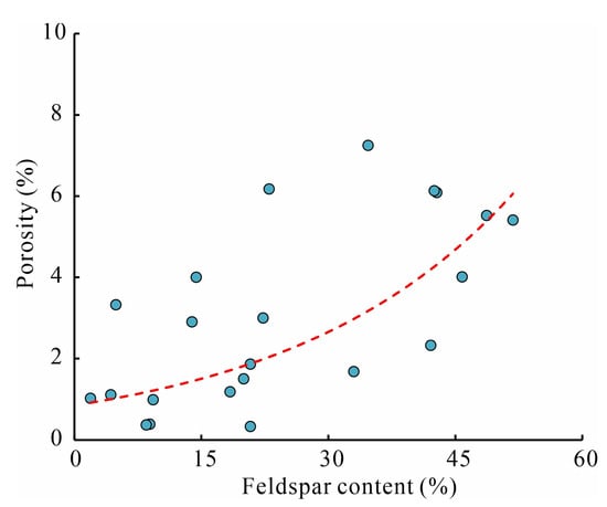 Secondary dissolution pores were the main reservoir spatial types developed in the Lucaogou Formation and were present in different lithologies (Figure 7a,b). The degree of development of secondary dissolution pores is mainly related to the dissolution of unstable components such as feldspar, tuff components, and rock fragments []. Potassium feldspar, albite feldspar, and other feldspars and their alteration products are strongly eroded by acid circulation, forming secondary dissolution pores.