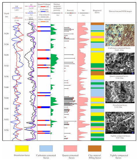 The vertical distribution of the diagenetic facies in a single well shows that the study area mainly develops dissolution facies, carbonate cementation facies, and dissolution facies, whereas quartz cementation facies and clay mineral-filling facies are less developed. Comparing the predicted diagenetic facies types with the corresponding depth of thin sections and SEM images, the predicted results have a high coincidence rate, which indicates that the model has a certain guiding significance for the accurate identification of diagenetic facies in tight oil reservoirs (Figure 13). From the conclusion of comprehensive logging interpretation, it can be seen that the dissolution facies develop in the interval whose mineral composition is mainly quartz and feldspar, as well as the interval with nuclear magnetic resonance (NMR) porosity and measured porosity, which has a high oil saturation value and is a favorable interval for reservoir development. Minerals are mainly composed of carbonate rocks because the cementation of carbonate rocks has a great influence on reservoir porosity; thus, the NMR porosity and the measured porosity of the reservoirs are both small and the oil saturation value is relatively low. Therefore, the reservoir physical properties corresponding to carbonate cementation facies-developed layers are the worst. Because of compaction, the NMR porosity is smaller than the measured porosity, and the oil content is poor. The physical properties of the reservoirs corresponding to the interval where quartz cementation facies and clay mineral-filling facies are developed are poor.