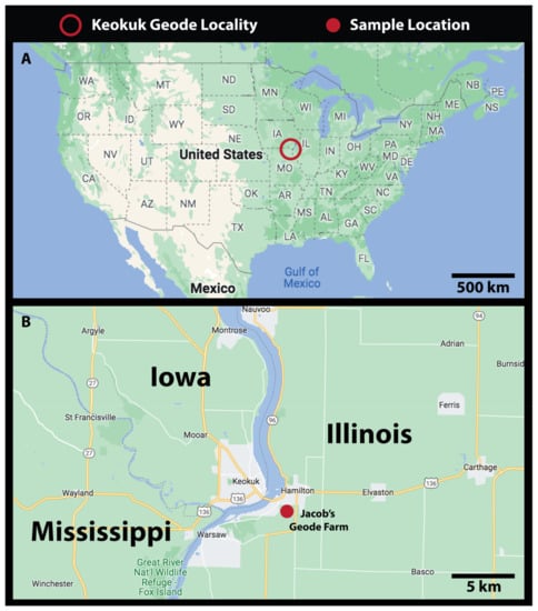 Keokuk geode region and collection site map. (A) A map of the united states indicating the general Keokuk geode locality. (B) A map the tri-state region indicating where the collection site Jacob’s Geode Farm is located.