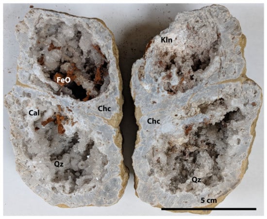 Keokuk geode halves exhibiting a “double geode” feature with two distinct cavities. Note the chalcedony (Chc) shell with inwardly radiating “druzy” quartz (Qz) crystals, rhombic calcite (Cal) crystals, patches of a white kaolinite (Kln) “dust”, and what appears to be remnants of iron-oxide (FeO).