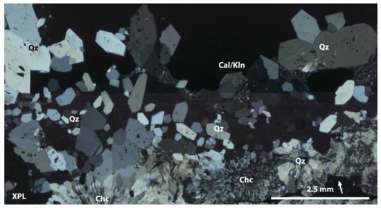 Thin-section of a portion of the geode’s shell shows pseudo-fibrous chalcedony (Chc) with quartz (Qz) terminations, larger discrete quartz (Qz) “druzy” crystals, and a rhombohedral calcite-kaolinite crystal (Cal/Kln). The arrow indicates the direction towards the center of the cavity. (TS, XPL).