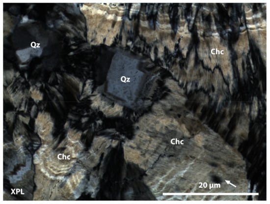 The chalcedony shell constitutes the largest volume of the geode. In thin-section under polarized light the chalcedony exhibits a pseudo-fibrous habit with growth lines in a chevron pattern (Figure 3 and Figure 4). Splays of chalcedony surround micron sized quartz grains and doubly terminated crystals which forms the matrix of the shell (Figure 4). This is consistent with previous descriptions of the chalcedony shell as a mosaic of quartzine, a pseudo-fibrous variety of chalcedony [10]. The chalcedony shell contains an abundance of inclusions including siderite, pyrite, and probable baryte, and celestine.