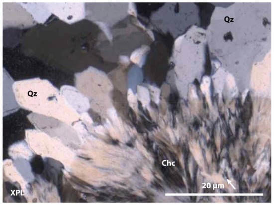 Thin-section reveals that quartz (Qz) terminations project directly from chalcedony (Chc). The arrow indicates the direction towards the center of the cavity. (XPL).