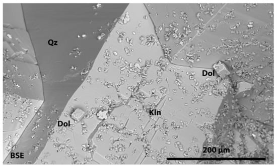 Kaolinite (Kln) crystals incorporated into the surface of a quartz (Qz) crystal accompanied by two rhombohedral dolomite (Dol) crystals. Note: The brighter spots are remnants of iron-oxide (BSE).