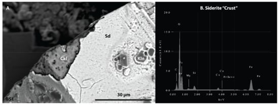 Figure 7. (A) Siderite “crust” (Sd) coating a calcite (Cal) crystal with kaolinite (Kln). (BSE) (B) EDX spectra of the siderite “Crust” (Sd). - Calcite “Flow”—Calcite containing up to about 15% kaolinite was observed on top of and in-between quartz crystals, and other mineral assemblages. This habit is characterized by ripple-like growth lines that indicate directionality (Figure 8A). In some instances, the “flow” builds into a stair-stepped structure with pits that contain kaolinite (Figure 8B).