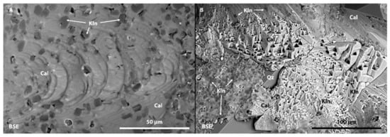 Figure 8. Calcite “flow” (Cal) incorporating kaolinite (Kln) crystals and (A) exhibiting growth lines that mimic ripple marks. (B) exhibiting a stair-stepped box-like structure. (BSE). - Calcite “Fill”—A particular conglomerate of about 20%–50% kaolinite and 5% dolomite in a calcite matrix is observed “filling” voids between quartz crystals, sometimes incorporating pyrite/goethite crystals. A similar calcite “fill” is associated with golf-ball-like siderite growths, baryte, and fragments of feldspar (Figure 9).