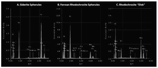 EDX spectra for (A) Siderite spherule (B) Ferroan Rhodochrosite Spherule (C) Rhodochrosite “disk.