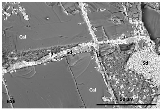 Figure 11. The surface of a calcite (Cal) crystal shows siderite (Sd) in cleavage cracks. (BSE).