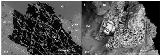 Figure 12. (A) Thin-section reveals that the siderite “framework” (Sd) follows the cleavage planes within the original calcite (Cal) crystal. (BSE). (B) The siderite “framework” (Sd) reflects the original rhombic habit of the calcite (Cal) crystal. (BSE). - Siderite “Nanoneedles”—Sub-micron acicular siderite crystals are associated with kaolinite crystals found associated with the siderite “crust” (Figure 7) and the siderite “framework” (Figure 13). Pom-pom-like clusters of these siderite “nanoneedles” appear almost exclusively along the edges of the kaolinite crystals, leaving the hexagonal faces exposed (Figure 13).