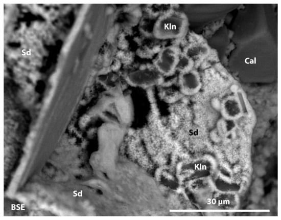 Figure 13. Sub-micron acicular siderite (Sd) “nanoneedle” crystals form “pom-pom” like clusters on the edges of kaolinite (Kln) crystals that have settled on top of a piece of the siderite “framework” (Sd). (BSE). - Spherules—Micron-sized spherules were observed in groups of about 3–5 on top of druzy quartz terminations (Figure 14). From group to group the spherules exhibit varying concentrations of iron and manganese, corresponding with siderite through ferroan rhodochrosite (Figure 10A,B). When associated with the “framework” larger (around 10 microns in diameter), hollow siderite spherules exhibit growth rings with slightly varying manganese concentrations (Figure 15). Similar sized spherules associated with the calcite-kaolinite “fill” exhibit a pitted golf-ball like texture (Figure 8) that the thin-section reveals is the result of a conglomeration of micron-sized sub-spherules.