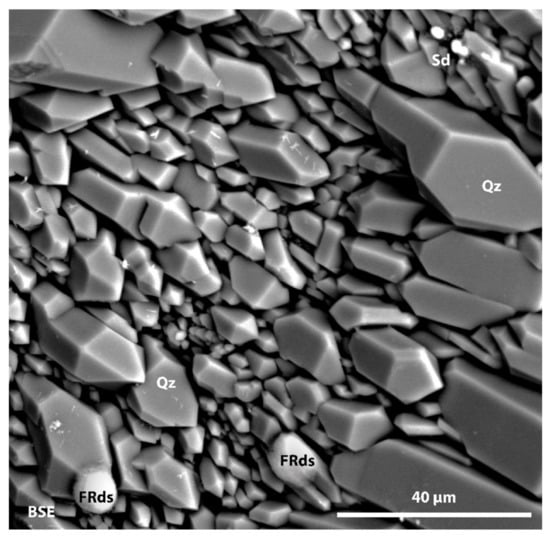 Figure 14. A pair of ferroan rhodochrosite (FRds) spherules near a group of siderite (Sd) spherules on top of quartz (Qz) terminations. (BSE).