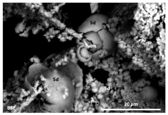 Figure 15. Siderite (Sd) spherules within the siderite “framework” exhibit growth rims. (BSE). - Rhodochrosite “Disks”- Rhodochrosite, with comparatively less iron than the spherules (Figure 10C), exhibits a flat circular habit (Figure 16). These beveled “disks” averaging 20–50 microns in diameter and are observed on top of larger druzy quartz crystals (Figure 16).