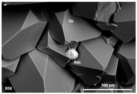 A micron-sized spherule containing lanthanum and cerium (Figure 21B) was observed protruding from a bitumen particle. We also observe several other mineral phases containing chromium, nickel, molybdenum (Figure 21C and Figure 22), tin, copper (Figure 21D), zinc, and lead. However, due to their size and proximity to other minerals, we cannot identify the species in confidence. Many of these phases are associated with the calcite “fill” (Figure 22) or occur on top of quartz crystals similarly to siderite, baryte, and hollandite thus corresponding to the later stages of paragenesis. During our preliminary thin-section analysis we observe another REE micro-spherule and tentatively (SEM/EDX) identify zircon, rutile, and xenotime (Figure 21E–G) associated with the calcite “fill” within the chalcedony shell. Additionally, occurrences of micron sized grains containing gold and silver have been observed included in the calcedony shell (Figure 21H,I).