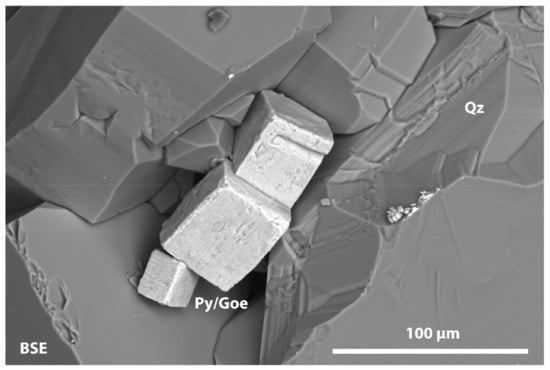 Pyrite (Py) micro-cubes nestled among a cluster of quartz (Qz) crystals exhibit a hatch-like texture from surficial oxidation forming goethite (Goe). (BSE).