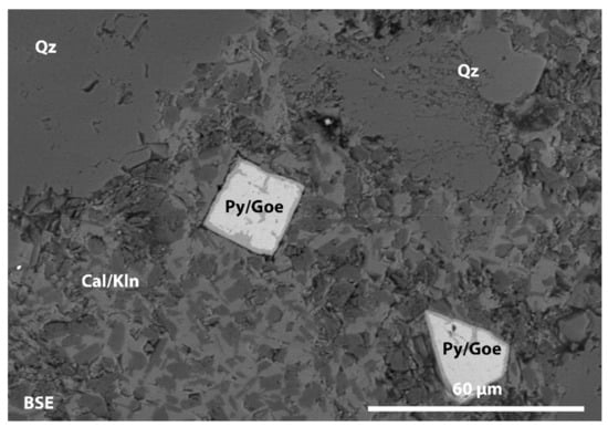 Thin-section of the calcite “fill” including kaolinite (Cal/Kln) and several pyrite (Py) crystals that exhibit a rim of goethite (Goe). (BSE).