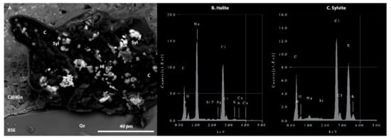 (A) A bitumen (C) particle featuring clusters of halite (Hl) and sylvite (Syl) micro-cubes, as well as siderite (Sd). (BSE) (B) Halite EDX and (C) Sylvite EDX from the corresponding minerals in the associated image.