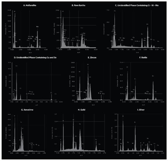 EDX Spectra of (A) Hollandite (B) REE Lanthanum and Cerium (C) Mineral grain containing chromium, nickel, and molybdenum observed on a dolomite crystal associated with the calcite “fill” (D) Mineral grain containing copper and tin observed in association with quartz. (E) Zircon (F) Rutile (G) Xenotime (H) Grain containing gold (I) Grain containing silver.