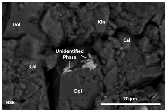 What appear to be fragments of the feldspar group are found incorporated in the calcite-kaolinite “fill” (Figure 9 and Figure 19). These grains exhibit various concentrations of potassium, calcium, and sodium.