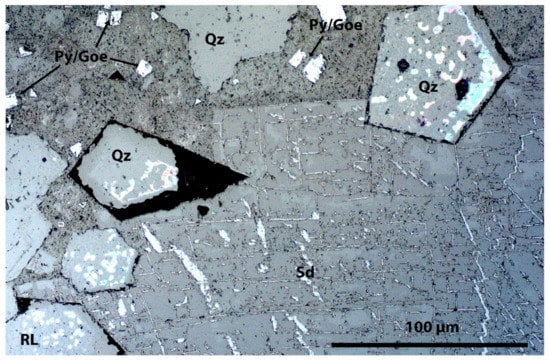Fluid inclusions in quartz appear to exhibit reflectance/iridescence. The quartz crystals appear alongside pyrite/goethite (Py) crystals in a silica matrix alongside the siderite (Sd) ‘framework”. (RL).