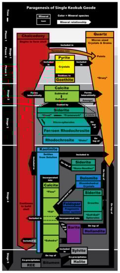 We have attempted to construct a plausible sequence of mineralization of a single geode based on the observations reported here. The paragenesis illustrates the constantly changing chemistry of the fluids percolating through the sediments and through the geode over geologic time (Figure 24). This should be considered a first pass attempt at describing the paragenesis of the specific geode of this study. We recognize at least five distinct stages of mineralization described below:
