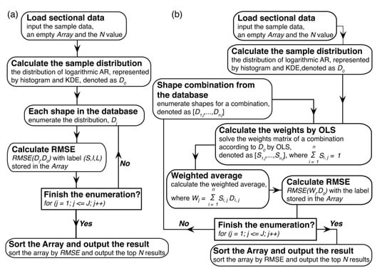 Flowcharts summarizing the algorithms for (a) single habit estimation and (b) mixed habits estimation. In the figure, N is the number of results to output, J is the loop times, AR represents the aspect ratio, and OLS represents the ordinary least squares.