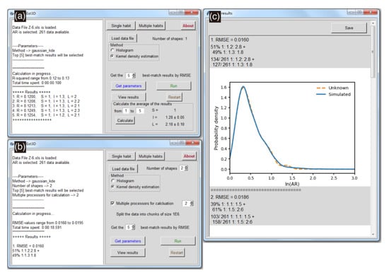 The “Load data file” button in the operation panel is in the upper left corner (Figure 3). The user can open the data file and load the sectional data. A file dialog appears when pressing the button, and only one data file is accepted to load into the memory. The data file should be in the extension of “.xls”, “.xlsx” or “.csv”. The spreadsheet created by ImageJ [48] is actually in a “.csv” format but has the “.xls” extension. The program first opens the data file in “.xls” or “.xlsx”. If an error occurs, the file is opened in ".csv" format. The program is designed without viewing the loaded data, so the data file should be specified. The spreadsheet should contain the columns with the headers named “Major” and “Minor”, or a single column named “AR” is also acceptable. If the sectional data are successfully loaded, the file name and the data size are printed in the textbox. The data are input as aspect ratio and logarithmically transformed for habit estimation.