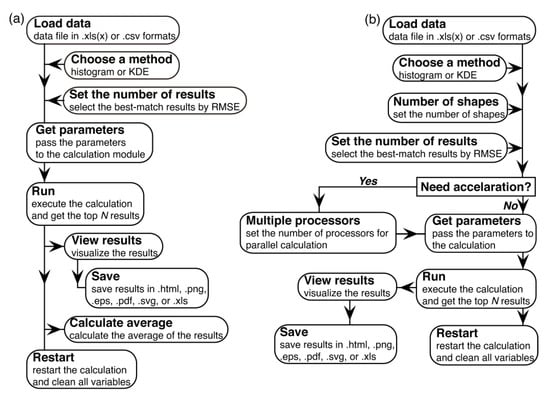 After the user presses the “Get parameters” button, the variables of parameters and logarithmical sectional data are sent to the calculation module included in a single file. Then, the user can press the “Run” button to start the calculation procedure. The module calculates the PDF, loads the database, and substitutes the unknown PDF and the pre-set data into Equation (1). The module contains two functions to estimate the habit. In addition, the user can take out the module separately to perform the calculation in python code if there are many samples to analyze. The workflow for the single habit estimation is shown in Figure 4a.