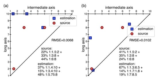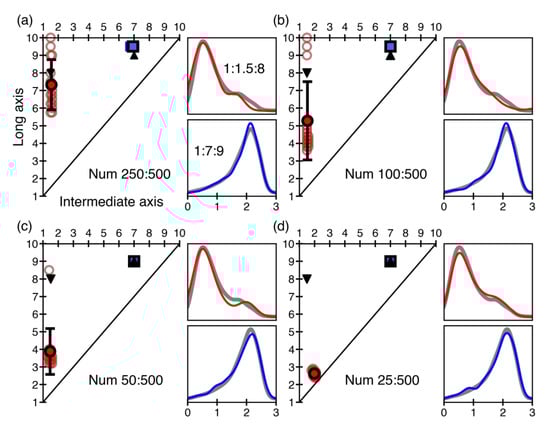 Figure 6a–d, the proportions of the prismatic habit continuously decline, and the estimation results change to a cubic-like habit, with the long axis being negligible. The corner point on the right part of the distribution curve represents the long axis, and the main peak on the left represents the intermediate (the red point with the black edge in Figure 6d). With the weight of the prismatic habit decreasing, the long axis is unlikely to estimate. For the ratios of 1:10 or 1:20 (Figure 6c,d), the prismatic habit has a smaller weight that can be ignored, but our model can still identify the main peak of the distribution, showing that multiple populations exist.