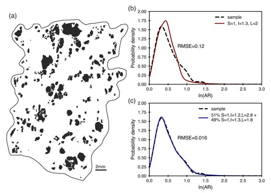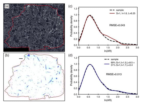 Sample Z-6 consists of two similar habits. Here, we use another example containing two different types of oxide habits to test whether our model can distinguish between isometric and elongated 2D shapes. An example of a basaltic sample FS-16 [50] is illustrated in Figure 9 with a petrographic photo and hand-traced outlines of oxide. The total number of hand-traced oxide crystals is 1011, large enough to avoid uncertainties brought by smaller crystal numbers. We observe that oxide has elliptical and elongated 2D sections (Figure 9a,b), probably two populations of different habits in the sample. In Figure 9c, two tails of the sample and the estimated result do not fit well, indicating that the estimated long axis is inaccurate. In Figure 9d, the estimation by multiple habits mode and the sample overlap well with RMSE = 0.013, showing an accurate estimation. Our method can also give a good fit of a mixture of isometric and prismatic habits.