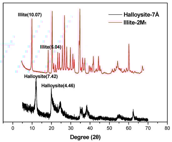 Halloysite is a hollow nanotube with a length of 600–1000 nm, and an inner and outer radius of 30 nm and 100 nm, respectively []. It is typically a 1:1 silicate mineral (Al2O3·2SiO2·4H2O), where tetrahedral SiO4 (Si-O layer) is in the exterior face, and the inner face has an octahedral AlO6 []. As for illite, which is 2:1 laminar silicate mineral, the top and bottom layers are tetrahedral SiO4 and mixed with an octahedral AlO6 in the middle []. There are several similar properties for halloysite and illite, such as the fact that surface hydroxyls can be protonated and deprotonated [], which has an effect on the adsorption mechanism of RE ions on clay surfaces. Their surfaces are electronegative due to isomorphous substitution; however, the points of zero charge (PZC), buffer pH and specific surface area (SSA) of halloysite and illite would be different, which is crucial information for the adsorption of RE ions.