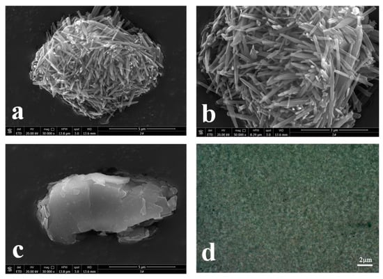 SEM (a–c) and microscope (d) images for halloysite (a,b) and illite (c,d).