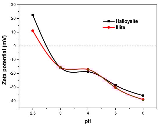 Zeta potentials were determined by a Malvern Zetasizer Nano ZS 90 instrument. A total of 5 mg of halloysite/illite was added into 50 mL of deionized water to obtain suspensions (0.1 mg/mL), and ultrasonically for 10 min; subsequently, the supernate was used for tests. Both 0.1 mol/L HCl and 0.1 mol/L NaOH solutions were used to adjust the pH of suspensions in a range of 2.5 to 6.