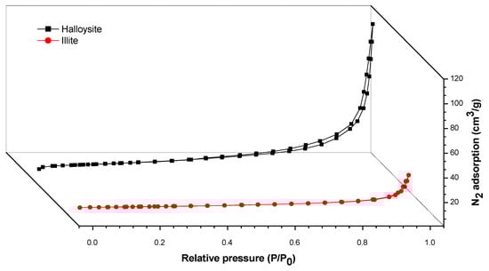 N2 adsorption–desorption isotherms were applied to measure the specific surface area of halloysite and illite, and the results are shown in Figure 4. The adsorption–desorption isotherms of halloysite and illite show a characteristic hysteresis loop, which is associated with capillary condensation in the mesopores. The SBET and pore volume of halloysite are 24.87 m2/g and 0.1854 cm3/g (Table 1), which is much higher than illite (6.78 m2/g, 0.0423 cm3/g) because halloysite is hollow nanotube, while illite is a tightly stacked lamellar, as shown in SEM images (Figure 2). Generally, high SBET is beneficial for the adsorption capacity.
