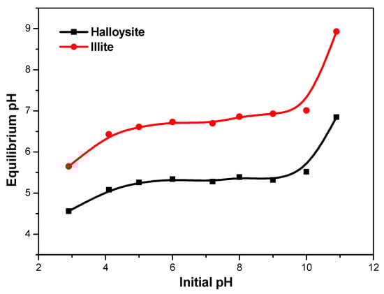 The surface hydroxyl of halloysite and illite can protonate and deprotonate depending on the solution pH, which is crucial for the adsorption of RE ions. Buffer capacity of halloysite and illite at different initial solution pH values are observed (Figure 5). It is shown that equilibrium pH levels of halloysite and illite stabilize at 5.3 and 6.7, respectively, when initial pH is in the range of 4 to 10. On the other hand, it is overflowing when initial pH levels are 3 and 11. Because the protonation/deprotonation sites of halloysite and illite were limited, plenty of H+/OH− were dissociated in the solution while initial acidity/basicity is high. These results reveal that halloysite and illite would protonate or deprotonate while solution pH levels are higher or lower than 5.3 and 6.7, respectively. The buffer pH levels indicate that halloysite and illite can almost be protonated in raw water, which goes against them adsorbing RE ions by surface complex.