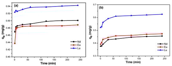 Figure 6 shows the qe of Nd3+, Eu3+ and Lu3+ on halloysite and illite as a function of contact time. It can be found that the qe of Nd3+, Eu3+ and Lu3+ on halloysite and illite increases quickly with an increase in contact time and reaches equilibrium in 60 min; beyond this value, there is no noticeable increase in the adsorption. Most RE ions are adsorbed within 5 min (~95%), indicating that the adsorption of RE ions on clays is quite rapid. This might be ascribed to the utilization of readily available adsorption sites of the clays, resulting in a fast diffusion and rapid equilibrium attainment []. The short equilibrium time indicates an excellent affinity of clays for RE ions []. The qe of Lu3+ is slightly higher than Nd3+ and Eu3+ due to a larger atomic weight of Lu, suggesting there is no apparent fractionation for light and heavy REEs on halloysite and illite. Despite the fact that the SBET of halloysite is larger than illite, the qe of halloysite is smaller than illite, which may be due to the narrow interlamellar spacing of halloysite (7 Å), which goes against the interaction between RE ions and active surface sites.