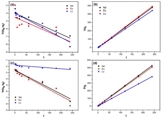 Pseudo-first order, pseudo-second order for Nd3+, Eu3+ and Lu3+ on halloysite (a,b) and illite (c,d).