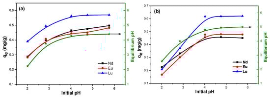 One of the vital factors which affects the adsorption behavior of RE ions is the pH of solution. The qe of Nd3+, Eu3+ and Lu3+ on halloysite and illite as a function of solution pH is shown in Figure 8. It can be seen that the qe of all RE ions on halloysite and illite increase with an increase in initial pH and nearly reaches equilibrium at a pH level of 4. The lower qe at low initial pH is caused by two reasons: one is of ZPC, which is the main driving force for RE ions adsorbed on clay surfaces, and low pH values contribute to the small absolute value of ZPC (Figure 3), which goes against RE ions adsorbing on clay surfaces; on the other hand, the presence of more H+ in an overly acidic solution leads to greater competitive adsorption between H+ and RE ions []. Previous analysis showed that the ZPC of halloysite and illite is similar, while the SBET of halloysite is much higher than illite, whereas the adsorption capacity of halloysite is lower than illite, which may be due to the narrow interlamellar spacing of halloysite where RE ions cannot pass through.
