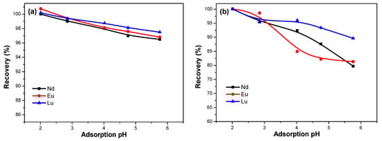 Adsorption pH plays a vital role in the qe of RE ions on halloysite and illite; on the other hand, it also influences the adsorption mechanism [,]. Figure 9 shows the recovery of Nd3+, Eu3+ and Lu3+ from halloysite and illite as a function of adsorption pH. The recovery of Nd3+, Eu3+ and Lu3+ from halloysite decreases slightly with the increase in adsorption pH (100.1% at pH 2, 97.5% at pH 6), which proves that pH has negligible influence on the adsorption mechanism of RE ions on halloysite within the tested pH range. The high recovery (>96%) at all tested pH ranges reveals that RE ions are adsorbed on halloysite surfaces mainly by electrostatic attraction. However, the recovery of Nd3+, Eu3+ and Lu3+ from illite decreases with an increase in adsorption pH. This may be attributed to the different adsorption mechanisms under various pH conditions. Similar to kaolinite [], RE ions adsorbed on illite by weakly electrostatic attraction, while illite surfaces are deprotonated at low acidic solution, and coordination bonds are formed between RE ions and illite surfaces [].