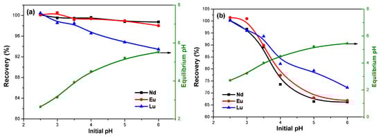 Effect of adsorption pH on the recovery of Nd3+, Eu3+ and Lu3+ from halloysite (a) and illite (b). (pH = 4.2, contact time = 240 min, (NH4)2SO4 concentration = 0.11 mol/L).