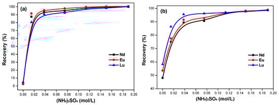 Influence of (NH4)2SO4 concentration on the recovery of Nd3+, Eu3+ and Lu3+ from halloysite (a) and illite (b). (Contact time = 240 min, pH levels for halloysite and illite are 4 and 3, respectively.)