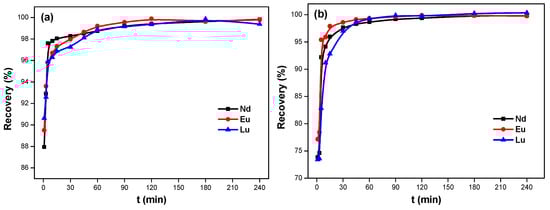 The recovery of Nd3+, Eu3+ and Lu3+ from halloysite and illite as a function of contact time is investigated, and the results are shown in Figure 12. The desorption efficiencies of RE ions from halloysite and illite are very fast, most of RE ions are desorbed within 5 min (~92%), and then slightly increase with an increase in contact time. A similar study reported that the leaching kinetics were very fast, within <5 min []. Process kinetics were found to be very fast; this fact can be attributed to an ion-exchange mechanism. The desorption rate of Lu3+ (heavy RE) is slower than Nd3+ (light RE), which may be due to the smaller ionic radius of Lu3+.