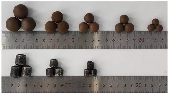 Cylpebs and ceramic balls were used in the experiments performed to determine the effect of the grinding media. To be more specific, the grinding media used for the experiments were cylpebs sized 14 × 16 mm, 12 × 12 mm, and 10 × 10 mm, provided by Goldpro New Material Co., Ltd., Handan, China, and ceramic balls with diameters of 25 mm, 21 mm, 17 mm, 15 mm, 14 mm, and 10 mm, manufactured by Betterwear New Material Co., Ltd., Jingdezhen, China. The compositions and physical properties of the cylpebs and ceramic balls used in the experiments are presented in Table 2 and Table 3, respectively. The photographs of the grinding media used are shown in Figure 2.