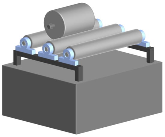 This experiment was carried out in a small-scale laboratory mill with a size of 90 mm × 132 mm, a volume of 2000 cm3, and a set speed of 170 rev/min. In each test, 200 g of −0.15 + 0.075 mm single-sized feed was used, and a volume of 100 mL of tap water was then added to the mill charge in order to make a 67 wt.% solids concentration. The illustration of the grinding equipment between the rolls is shown in Figure 3.
