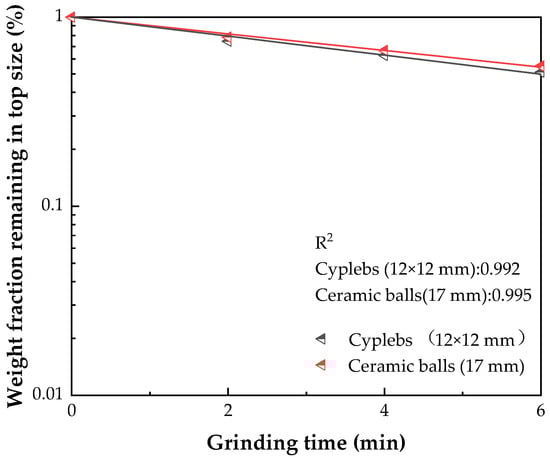In order to verify that the breakage behavior follows the first-order kinetics, first, in the comparative experiments between 17 mm ceramic balls and 12 × 12 mm cylpebs under the same charge volume, the ceramic balls and cylpebs were first ground for 2, 4, and 6 min. Then, the comparative experiments of the total surface area, number, and mass of ceramic balls were conducted, with the grinding time of the other sizes of ceramic balls and cylpebs kept at 2 min.
